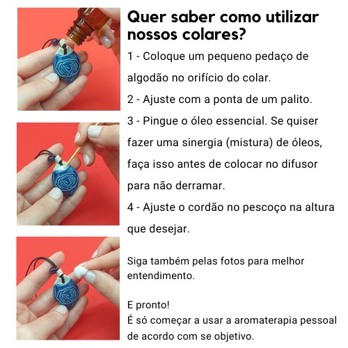 Cada colar aromático é produzido num processo totalmente manual em cerâmica de alta temperatura que lhe confere uma sinterização ideal para que o óleo não entre em contato com a pele deixando somente o aroma fluir.
